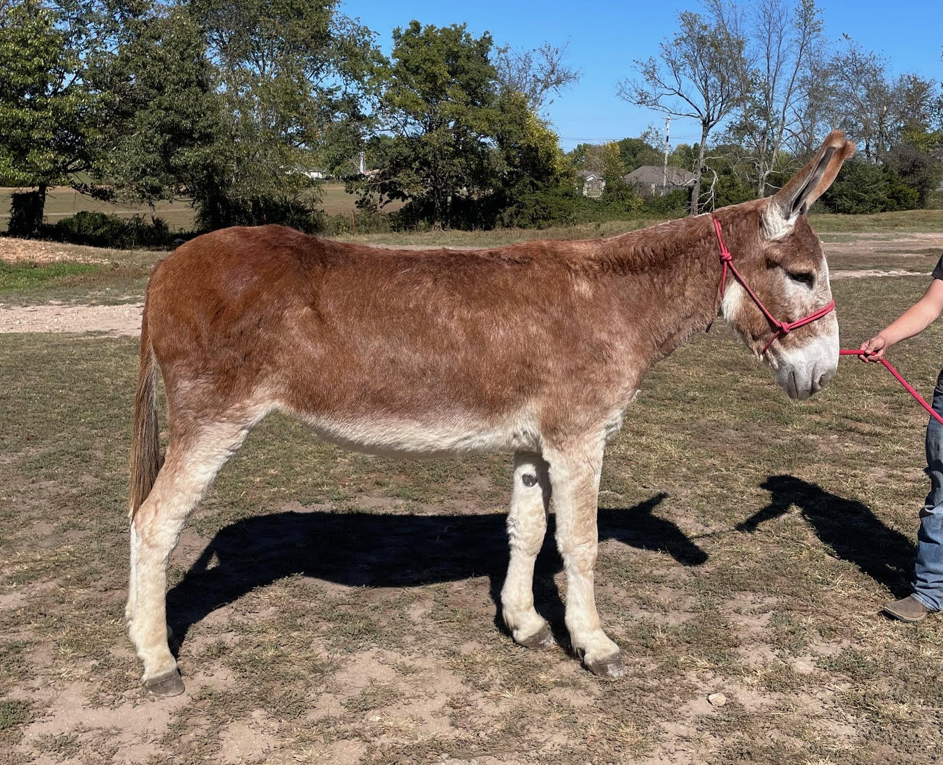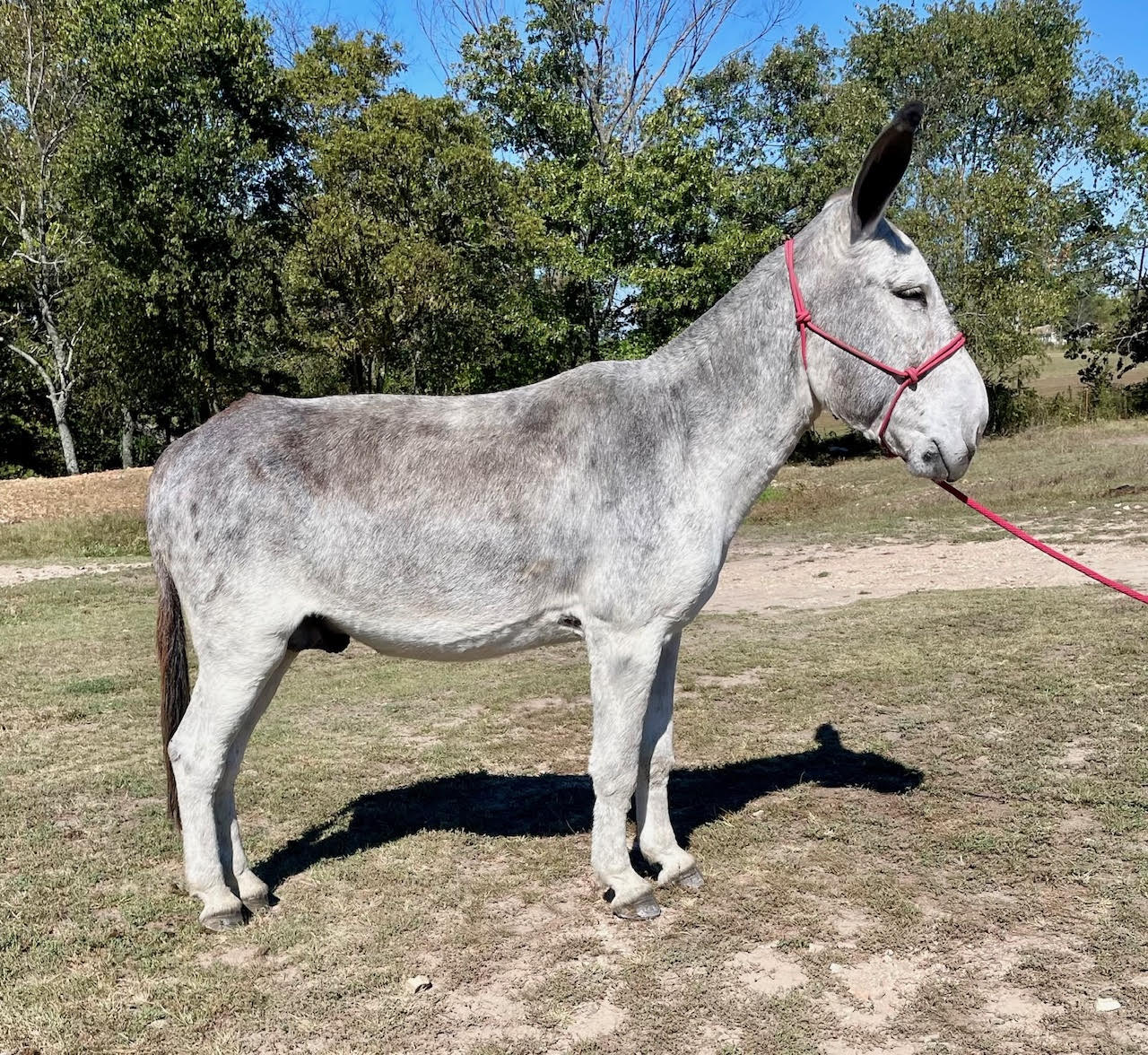 Bodie - Is a 14 year old dark red gelding that is 55 inches tall. First off, the picture shows gray but Bodie has been freshly body clipped and will have a dark red natural coat when his gray color is gone. Bodie is an excellent riding donkey that has plenty of bone to carry a load. He has a wide chest and straight legs that add strength as well. He has, like all of the other ones, passed all of our tests like lead, load, traffic safe, goes out alone, stands quietly to saddle and mount, crosses water, and is good with cleaning his feet. If you have been wishing for searching for a mature, safe, well built saddle donkey, you are invited to come to our farm and ride for yourself.