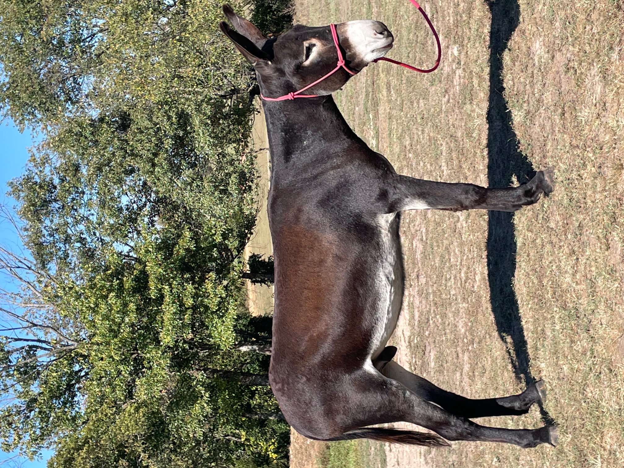- is a 3 1/2 year old black gelding with white points that is 53 1/2 inches tall and still growing. Ricky is an outstanding saddle donkey that has everything it takes to be a life long trail buddy for someone who wants the best. He has passed every requirement we have asked him to do before going out to the public. He is good with his feet, is traffic safe, goes out alone when asked, quietly stands to be saddled and mounted, trailer loads without objection, walks, trots and lopes at your request. He walks out at a good pace, will lead, follow or stay in the middle of the group. We could go on and on so just let me say that Ricky will willingly do everything any well broke riding donkey could be asked to do. As always, we truly invite you or you and your family to come here and ride him for yourself. We are always amazed at the people in our business who discourage or even refuse to have people come to their farm and ride for themselves.