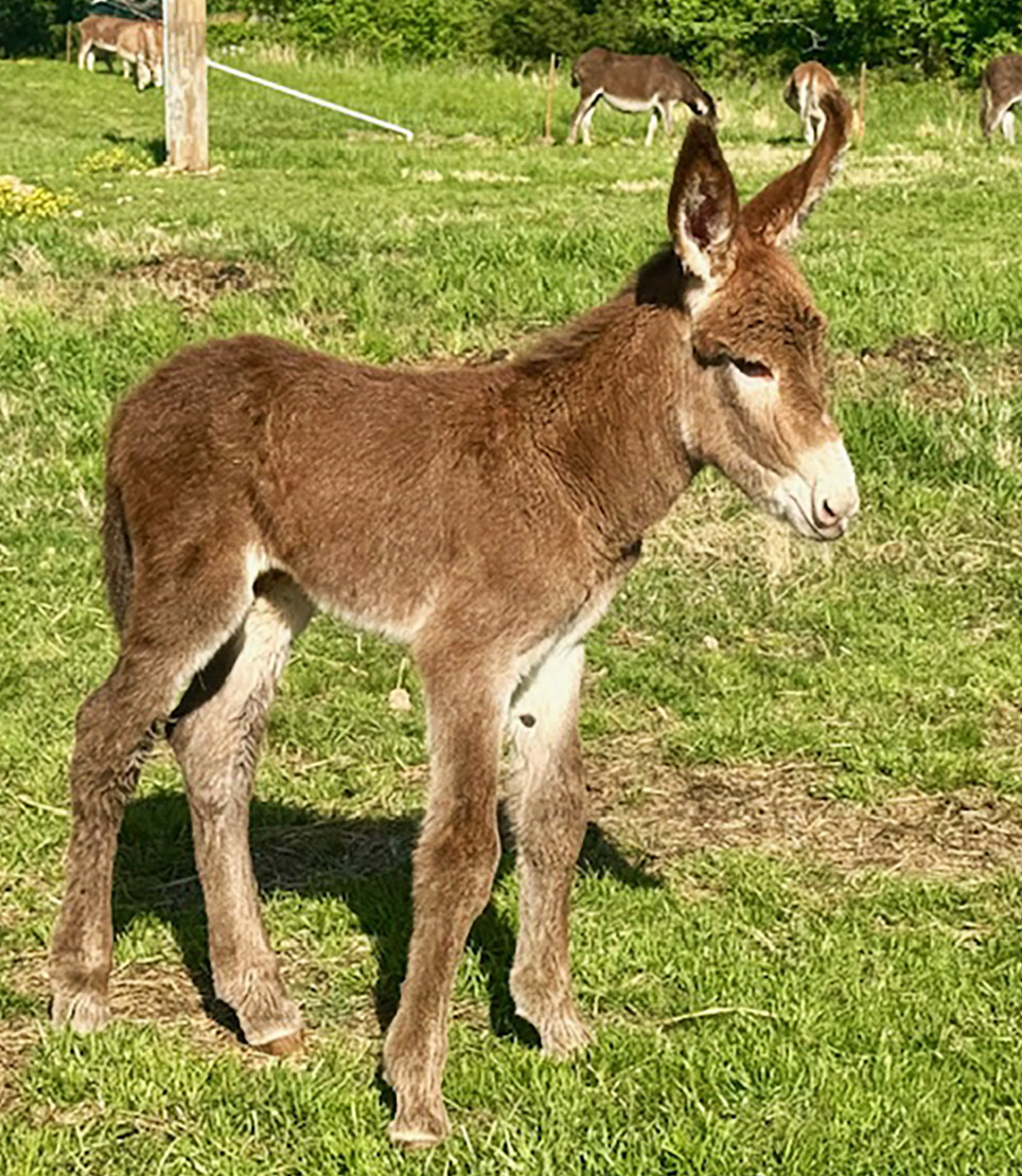 This beautiful little girl is the first in the lineup for 2026. She was born on 4/20/2026, and she is out of a sorrel 56 1/2 Jenny and a 61 inch sorrel jack. She is full of life, and is having the time of her life running around the farm.